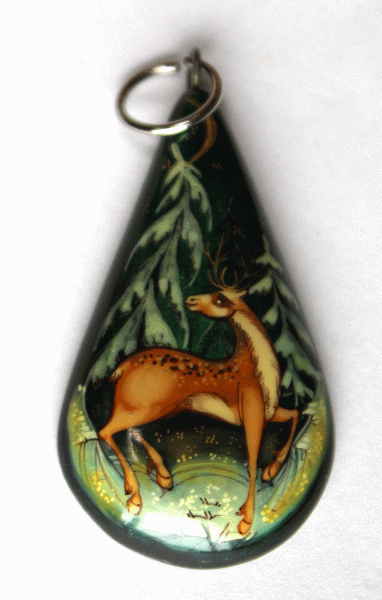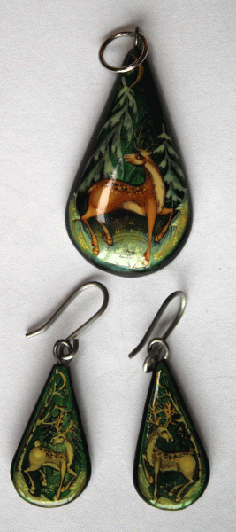 RUSSIAN HAND PAINTED SET-DEER- 07 $79.95 This set (earrings and pendant) was hand painted in Russia by Russian artist. It is made out of papier-mache. The set is painted under magnifying glass with one bristle brush. Because the items are one-of-a-kind they may be slightly different from the picture. Size of the pendant 1.5†and earrings without hook is 1â€; Earrings with hook is 1.75â€. This Russian hand-painted set is very unique and different. Look for some possible matches of Russian hand-painted ring on our site.