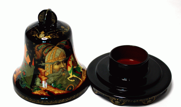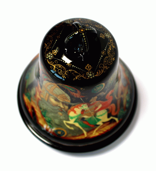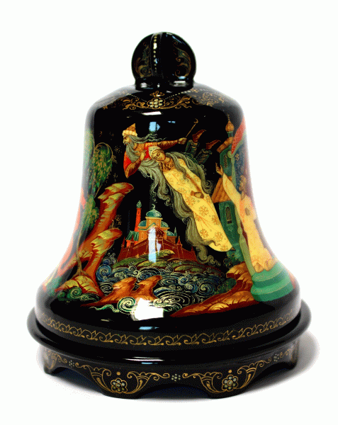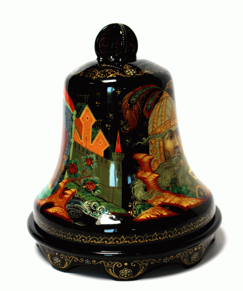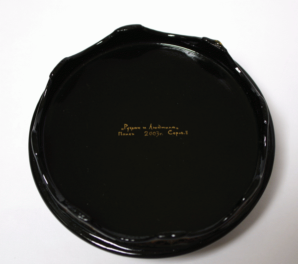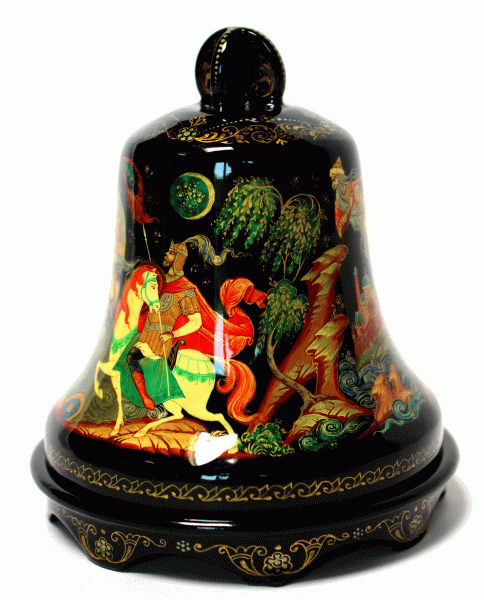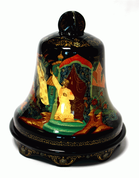 Russian Lacquer Box Hand Painted Signed Fairy Tale Ruslan & Lyudmila Bell Shape #132 $495.00 It is absolutely unique lacquer box made out of papier-mache in Russia in 2003. It was painted and signed by Russian artist Serov; Palekh Art School. The box is painted all around by one hair brush under magnifying glass. The name of the art composition is ''Ruslan & Lyudmila''. This is a famous Russian fairy tale by great Russian poet Pushkin. The black and white copy of the fairy tale will be enclosed with the order. The size of the box is H= 4.25'', diameter is 3.75''. If you need additional pictures or information, please contact us. Must for any collection!!! At Russian Island we sell only original hand painted Lacquer boxes. It takes a lot of time and skill from highly experienced artists to create a fully hand painted box. We guarantee that our boxes are fully hand painted in Russia by professional artists. Russian lacquer boxes are well known all over the world. There are four villages located not far from Moscow, which create Russian lacquer miniatures for Centuries. The schools of this art (named by villages) are PALEKH, MSTERA, KHOLYI, and FEDOSKINO. Excellent vintage condition; pictures are part of description. You will get the exact box you see on the pictures. Will ship from Texas in 2 business days.