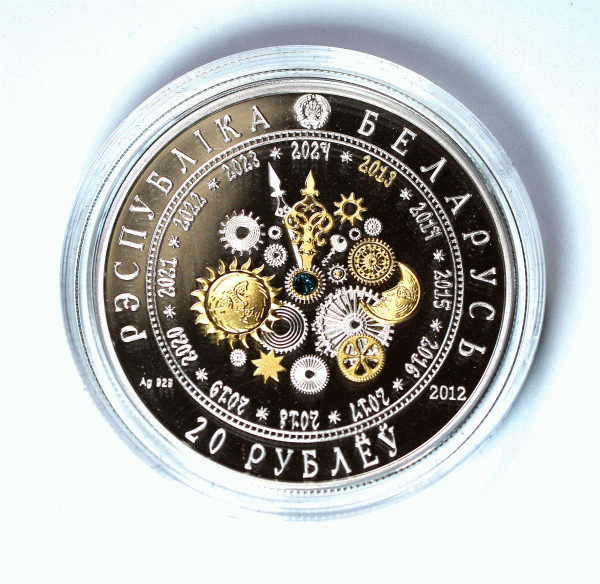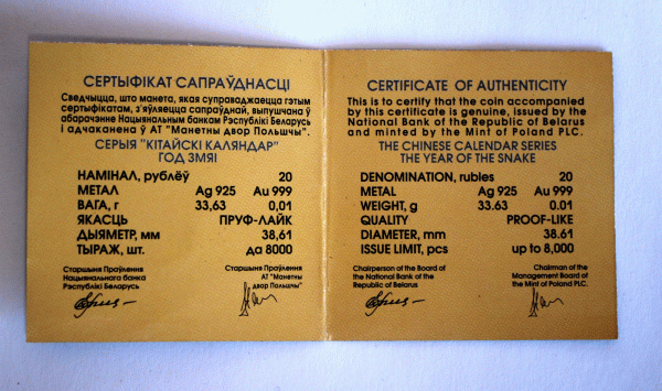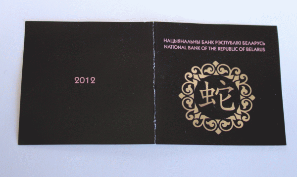 | Belarus Silver 20 Ruble Coin 2012 Year of Snake Chinese Calendar Series #189 $364.95 This is a Belarusian 2012 Silver 20 Rubles PROOF coin from the Year of the Snake series. The coin has a diameter of 38.61mm and weighs 33.63 grams of .925 silver. It features a cubic zirconia gem inlay and gold-plated elements. With a limited mintage of 8,000 pieces, the coin has a rarity index of 85, making it a valuable collector's item. The obverse side displays the emblem of the Belarusian Republic and elements of a clock with a crystal at its center. The reverse features a coiled snake surrounded by stars and ornaments, with a Chinese character in the middle. Both sides were designed by S. Zaskevich. The coin was minted at the Mint of Poland in Warsaw and has a reeded edge. It is in uncirculated, proof mint condition and comes in its original airtight capsule and box from the Belarus Bank and Belarusian Bank certificate of authenticity. You buy what you see on the pictures. Pictures are part of description. Ship from Texas within 2 business days. NOTE: The capsule was not opened; the pictures were made through the capsule plastic; the coin is in superb MINT condition; any imperfections you see are on the plastic.