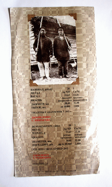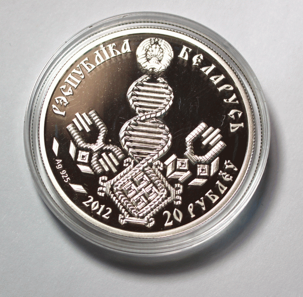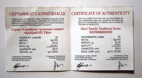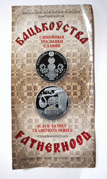 | Belarus Silver 20 Ruble Coin 2012 Slavs Family Traditions Series-Fatherhood #191 $144.95 This is a Belarusian 2012 Silver 20 Rubles BU coin from the Slavs' Family Traditions Series – Fatherhood. The coin has a diameter of 38.61mm and weighs 33.63 grams of 0.925 silver. Used technique: Pad–printed elements. With a limited low mintage of 10,000 pieces, the coin has a rarity index of 89, making it a valuable collector's item. Obverse: Emblem of the Republic. Decorative composition of straw craft representing DNA. The reverse: Stork bringing a baby. Designer: Svetlana Nekrasova. Minted at Polish Mint (Mennica Polska), Warsaw, Poland. Release date: October 23, 2012. The coin is in uncirculated, BU mint condition and comes in its original airtight capsule and Belarusian Bank certificate of authenticity and Fatherhood brochure. You buy what you see on the pictures. Pictures are part of description. Ship from Texas within 2 business days. NOTE: The capsule was not opened; the pictures were made through the capsule plastic; the coin is in superb MINT condition; any imperfections you see are on the plastic.