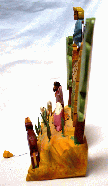 | Christmas Hand Carved and Painted Wooden Nativity Set Removable Figurines #72 $299.95 This exquisite, one-of-a-kind Nativity set has been beautifully hand-carved and hand-painted by the Russian artist Sarafinchan. Crafted entirely from wood, the scene is remarkably detailed. Most figurines, including the trees, animals, and grass, are removable, allowing for versatile display options. A unique kinetic feature allows the angel's wings to move when an attached string is pulled. In excellent vintage condition, this set measures 11'' W x 9.5'' H x 3.25'' T. We guarantee you will receive the exact item pictured, as the images are an integral part of the description. Shipping from Texas within 2 business days, this unique nativity scene makes a wonderful holiday present or a standout addition to any collection.