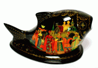 Russian lacquer boxes are well known all over the world. The main schools of Russian lacquer miniatures is a unique branch of world applied art. There are four villages located not far from Moscow, which create Russian lacquer miniatures. The schools of this art (named by villages) are PALEKH, MSTERA, KHOLYI, and FEDOSKINO. Artists of these schools painted religious icons (miniatures) for many centuries. After the Communist revolution (1917) they were not permitted to do icons and they began to make lacquer boxes. Each village has its own style and favorite subjects: fairy tales, village scenes, landscapes, and bouquets. The first Russian lacquer factories appeared at the beginning of the 18th Century. The villages worked together to create the unique designers, using methods that have been passed on for generations. Some cut the cardboard to size, cover it with paste, and press it in mold to dry it and then deep it in linseed oil. That is when the carpenters take over. They plane and sand the forms they apply putty made by hand to each box and smooth it so the painters can readily coat each box with lacquer, then send the box to the artist. The artist draws an outline, paints it in with zinc white, and covers it with colors, which are egg emulsion tempera made fresh in extremely small quantities. Gold leaf is applied and burnished with a wolf tooth. All artists make own brushes from squirrel hair and often paint their detailed designs with one hairbrush under magnifying glass. Each box requires incredible amount of work.