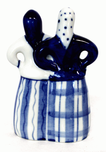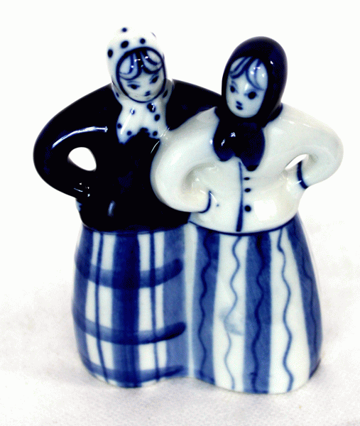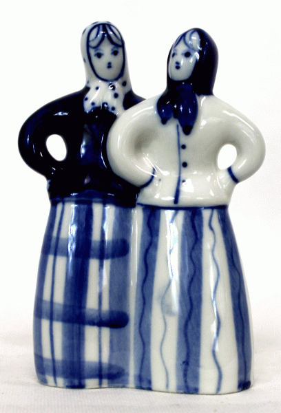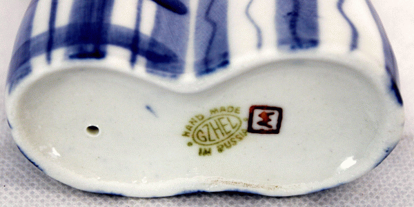 | VINTAGE RUSSIAN BLUE and WHITE PORCELAIN - GZHEL FIGURINE #65 $39.95 This Gzhel figurine is hand-painted by Russian artist in village of Gzhel in Russia in 1990s. The figurine has official stamp of Gzhel production factory (see picture). If you are collecting original Gzhel items please be sure that the item has stamp exactly as you see on the picture!!! Size is 5.25 inches high. Gzhel is the famous blue and white porcelain from Russia. This porcelain takes its name from village of Gzhel located 60 km from Moscow. Blue color Gzhel got from blue cobalt. The name Gzhel originated from the Russian word, which means burn, in the sense of firing clay. The region of Gzhel is famous for its fabulous clay. In the 17-th century Russian Tsar Alexey Mikhailovich learned about super clay and large-scale production began. Porcelain from Russian Gzhel has a long history, from semi-faience to faience, and later to porcelain. Please visit other pages of our website for more Russian/USSR great souvenirs and collectibles.