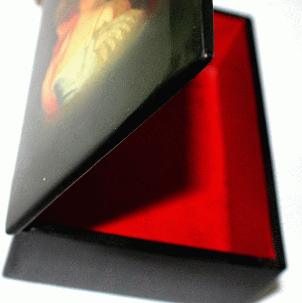 | OLD RUSSIAN LACQUER BOX-GIRL WITH RED RIBBON $849.00 Size 6x4.5inch; school FEDOSKINO; artist FIRIN.Unique extremely detailed oil painting. Very rare old 1955 box.At Russian Island we sell only original hand painted Lacquer boxes. It takes a lot of time and skill from highly experienced artists to create a fully hand painted box. We guarantee that our boxes are fully hand painted in Russia by professional artists. There are some on the internet that sell a lot of fake boxes with the prints glued on top of the box, some of them might even have a little touch up paint (painted by amateur “artistsâ€) to top of the box. They will try and call these “hand painted†but they use those words to simply mislead buyers. This fake method does not take nearly the time and effort it does to truly hand paint a lacquer box with a single haired brush (we are talking days vs minutes). You can check the authenticity of the box by looking at the top under a strong magnifying glass. On the fake ones you will see the small dots from the print on the larger picture areas.