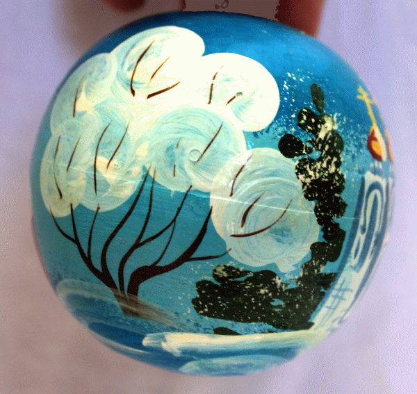 | RUSSIAN HAND PAINTED CHRISTMAS ORNAMENT -WINTER CHURCH #99 $19.95 This is nice hand made and hand painted Russian Christmas ornament. It is made out of wood in Russia in 1980th. It is hand painted by Russian artist; one of a kind. The painting may be slightly different in each item because they are hand made and hand painted. Size is 3'' diameter'. Please check other pages of our website for Christmas nesting dolls, Santa and Angels.