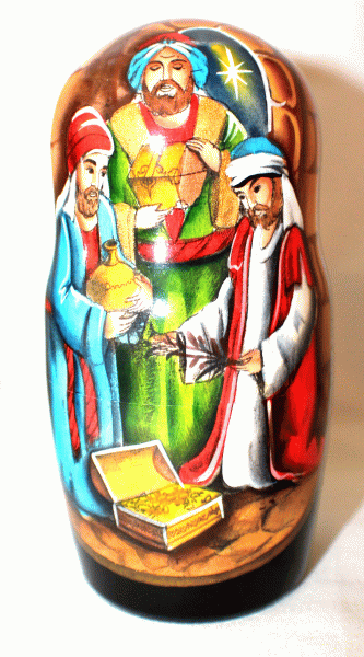 | Traditional Russian Nesting Doll Nativity 5 Pieces made in Ukraine in 1990s #38 $99.95 This vintage Nativity set of 5 pieces nesting doll, matryoshka, matreoshka, matrioshka is absolutely beautifully hand painted in Ukraine (former USSR) in 1990s. Size 6.75 inches. It is a great Christmas gift and also great for any collection. Excellent vintage condition (see pictures). Please look carefully at the pictures, as they are parts of the description. Because nesting doll is handmade, it might have some imperfections. Ship from Texas in 2 business days. Please check other pages of our website for Christmas ornaments, Santa and Angels.