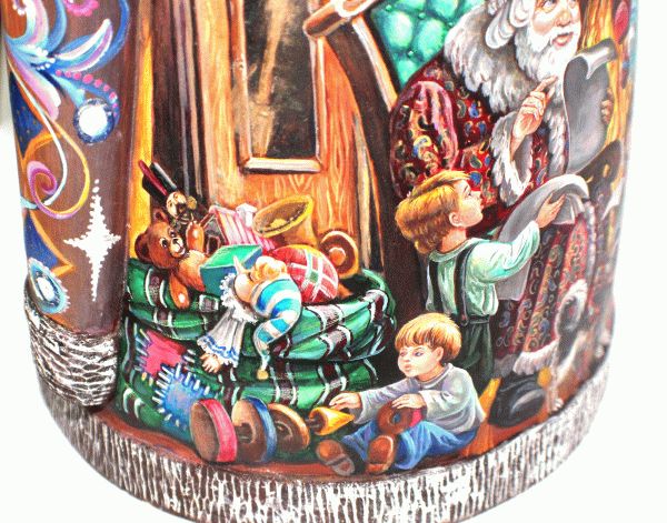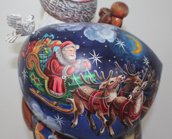 | Russian Christmas Magnificent Masterpiece Museum Quality Wood Santa Old World Carving & Hand Painting Technique Unique One-of-a-Kind #38 $2,495.00 This huge magnificent Russian wood carved and hand painted Santa is a true Masterpiece and the great idea for Christmas gift. It is carved from one piece of aged lime-wood (except stick, bird and squirrel which are removable). Extremely intricately hand painted by great Ukrainian artist Maxim Skalsky. The paintings are made in Old World Christmas Tradition style. It has detailed paintings of Christmas City Decorations with kids playing outside, Children receiving gifts from Santa Claus, Santa riding deer and much more. This unique MUSEUM QUALITY ART WORK makes this great Santa one of a kind; the Santa holds stick, bird and squirrel which are hand painted and removable. This Russian Santa will make your Christmas happy. It will create wonderful Christmas spirit for your family for many Christmas seasons to come. Enjoy this magnificent Museum Santa sculpture. Size is 18.5 x 10 x 10 inches. Please check other pages of our website for Christmas ornaments and Christmas nesting dolls. If you need more pictures please let us know.