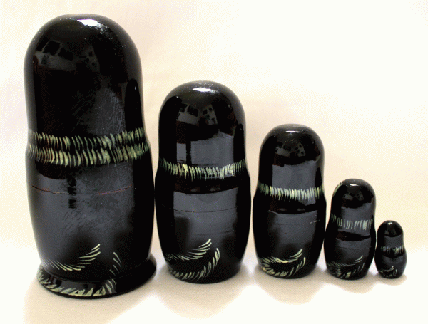 | Vintage Painted Nesting Doll Matrioshka Made in Russia 5 Piece Black Cat #228 $49.95 Russian Island is selling ONLY handmade and hand painted dolls !!! No cheap copies, all the dolls are authentic !!! This doll is hand painted in Russia, Sergiev Posad and signed by Russian artist in 1990s; 5 pieces. H 5.25 inches. The dolls have paintings of 5 black cats .There may be slight variations in painting because all the dolls are hand painted but they are very close to the picture. The doll is in very good vintage condition. In Russia making wooden objects which fit each inside other has many Centuries tradition. Gradually these figurines became to be carved in the shape of dolls. These dolls were made and painted by Russian craftsmen. This fabulous Russian doll was given the name MATRIOSHKA [matryoshka, matreshka] which originated from root of the word maternity. It became a symbol of FERTILITY and PERPETUATION. It is a good luck present for a very long time.