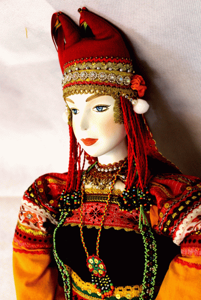 | RUSSIAN HANDMADE DOLL - XIX CENTURY COSTUME OF TAMBOV PROVINCE IN RUSSIA #28 $689.95 This doll was made by famous Russian artist Tatyana Sokolova who lives in Moscow. This particular Russian doll represents the XIX Century antique costume of Tambov province in Russia. The face of the Doll is hand sculptured of papier-mâché according to the old recipe, which Artist Sokolova found in the book published in XIX Century. This doll has handmade dress, headwear, shoes and underwear with a lot of details (see pictures). Size of this Russian doll is 29''. Tatyana Sokolova is one of the best Russian artists who specializes in old Russian costumes. She worked with the most famous Russian costume designer Vyacheslav Zajtsev. Tatyana was always interested in the history of old Russian costumes. She is creating her Dolls in the costumes of different Russian guberniya (provinces) of XIX century. In her work Tatyana pays a lot of attention to the smallest details of the costumes. Before doing any particular costume, she is studying about it and about that time and region in different old publications and museums in Moscow and St. Petersburg. Tatyana does not have any assistants; she is doing all work including smallest details by herself, except shoes, which are made by her father (he is a Master who knows old secrets). The process of making Dolls is very time consuming that is why Tatyana is able to do not more than 20-25 Dolls per year. Tatyana uses for her doll’s costumes only natural fabrics and, if possible, antique fabric from grandmother’s chests. She makes by herself all necessary embroidery, laces, jewelry, etc. Tatyana Sokolova is well known around the Globe because of her unique work. She had very successful exhibits in USA, Belgium, Spain, France, Portugal, etc.