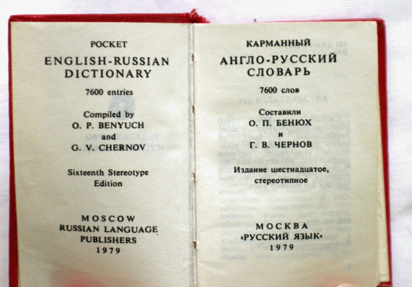 | Rare English Russian Pocket Dictionary -7,600 Entries #7 * $24.95 This nice very rare pocket English - Russian Dictionary was composed by O.P. Benyukh and G.V. Chernov. This dictionary has about 7,600 entries. The dictionary was published in 1979, in Moscow, USSR. Russian Language Publisher. Hard cover, size is 2.25 x 3.25 inches. The dictionary is in excellent condition. Please visit other pages of our website for more variety of Russian and Soviet gifts, collectibles, antiques, jewelry and much more.
