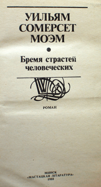 | Russian Vintage Book,Of Human Bondage by William Somerset Maugham Сомерсет Моэм, Бремя Страстей Человеческих #64 $24.95 This vintage book Of Human Bondage by William Somerset Maugham (СомерÑет МоÑм, Ð‘Ñ€ÐµÐ¼Ñ Ð¡Ñ‚Ñ€Ð°Ñтей ЧеловечеÑких) Printed in Minsk, USSR in Russian Language translated from English; 1988. Mastatskaya Literatura Publisher. William Somerset Maugham CH was an English playwright, novelist, and short-story writer. He was among the most popular writers of his era and reputedly the highest-paid author during the 1930s. Of Human Bondage is one of the most famous novels of English writer William Somerset Maugham. The novel was written in 1915. The protagonist – Philip Carey, is an orphan and is with a lame leg, which makes his life very difficult. Size is 8 x 5â€, Hard cover, 637 pages. The book is used and it is in good condition. Please visit other pages of our website for more variety of Russian and Soviet gifts, collectibles, antiques, jewelry and much more.