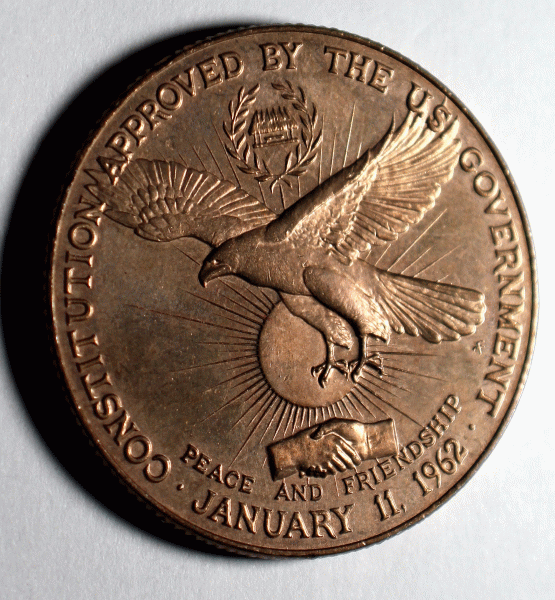 | The Miccosukee Tribe - Great Fathers Copper Coin 1962 #95 $49.95 This is 1962 rare copper coin, issued on January 11, 1962. 43mm diameter, about 1oz weight. On front side is written “The Miccosukee Tribe - Great Fathers†, on the back “constitution approved by the US Government; peace and friendship, January 11, 1962â€. You buy what you see on the pictures. Please visit other pages of our website for more variety of Russian and Soviet gifts, collectibles, antiques, jewelry and much more.