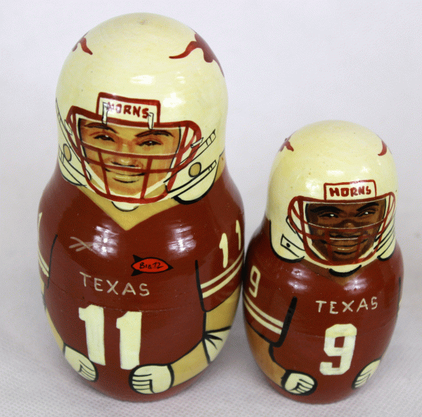 | Russian Hand Painted Nesting Doll-Sport -Texas University-Longhorns football team #11 $59.95 Russian Island is selling ONLY Russian made dolls !!! No cheap copies, all the dolls are authentic !!!This is a Russian nesting doll Matrioshka with 2000s Texas University-Longhorns football team. This 5-piece nesting doll set is a great collectible item. This set is hand painted and signed in Sergiev Posad, RUSSIA by Russian artist. This is a very rare nesting doll with 5 players who played in 2000s: Williams, Applewhite, Cavil, Humphrey, and Renfro. Size – 7â€. The doll is one of a kind. You will receive exactly set what you see on the pictures. Please visit other pages of our website for more original authentic Russian collectibles and souvenirs.