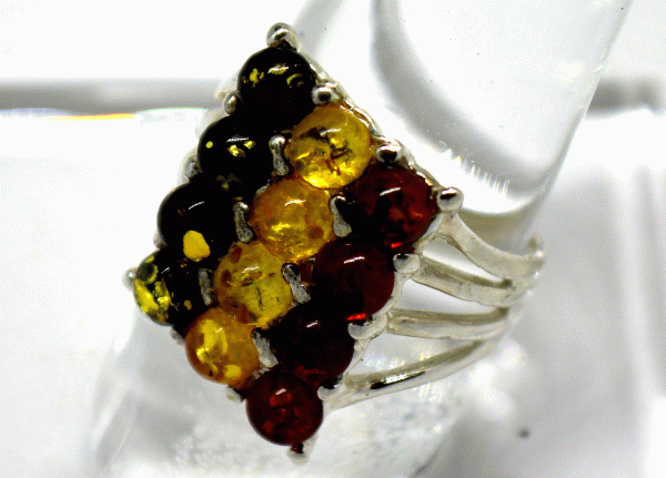 | Baltic Vintage Genuine Multi Color Amber Ring Sterling Silver Made in Poland #58 $54.95 This is beautiful vintage 1990s Baltic Sea Genuine Amber ring hand set in 925 sterling silver in Poland. Choose from available ring sizes: 5, 5.5, 6.5, 7, 7.5; size of silver setting 0.75 x 0.5''; size of each amber stone 0.2'' (12 stones); weight is 5.2 G. Amber is the fossilized, hardened resin of trees, ranging in age from less than a million to more than 300 million years old. This beautiful Baltic Amber has been popular throughout the World for Centuries and is reflected in many of the regions folk tales. Amber Jewels are actually pieces of petrified tree sap and found in only three areas throughout the World. Occasionally, you may find pieces of insects or plants trapped inside these jewels but they are quite rare. Amber has a unique quality of being light enough to float on water and was originally explained through folk tales as being gifts from the young maiden Ambrella to her parents after she was kidnapped by the Prince of the seas. Amber is thought to help absorb negative energy and to release bright, soothing energy, helping to calm nerves and enliven disposition like a mental sunny day. More jewelry you can see at http://russianisland.com/subCategory.php?ID=7