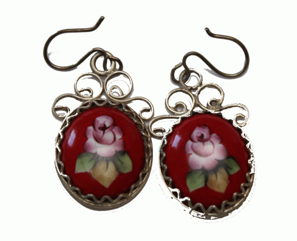 | Vintage Unique Russian Enamel Hand Painted Jewelry Set Earrings + Necklace #33a $106.95 This set was made in Rostov Great (Russia). It is completely hand painted. The process of making this type of enamel work is very complicated. After each color the jewelry must be fired in a special oven then cooled off and painted with the next color. This process is repeated as many times as there are colors on the jewelry piece. They are absolutely gorgeous and unique. Beautiful finift ensemble - necklace and matching earrings in floral design set in an intricate hand made filigree. Very fine detail and superb metalwork. Earrings are designed with French wire backings. Necklace length 18â€; Earrings – 1.25 x 0.75'' (without hook). More jewelry you can see at http://russianisland.com/subCategory.php?ID=7