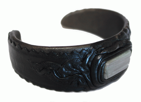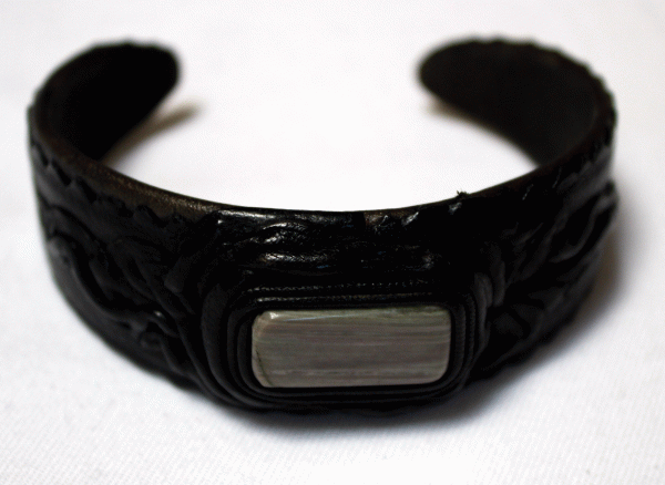 | Vintage Unique Russian Handmade Agate Jewelry Mounted In Leather-Bracelet #52 $69.95 This vintage piece of beautiful jewelry is a unique bracelet handmade by Russian artist. It is made in Russia out of ''landscape'' agate hand mounted in genuine leather. It has steel plate inside the leather to make bracelet rigid and stay conveniently on the hand. The leather design is all hand made. The bracelet is one-of-a-kind; you will get what you see on the pictures. It is a unique piece of jewelry, which is very stylish. Size of the bracelet is 8 inches but it can be slightly adjusted; stone is 0.9 x 0.5 inches. More jewelry you can see at http://russianisland.com/subCategory.php?ID=7
