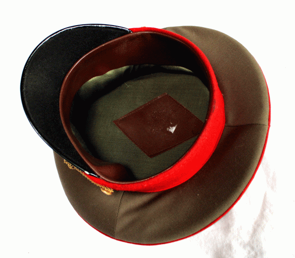 | USSR Embroidered Hat Service General Uniform & General Cap Badge #139 $199.95 USSR vintage hat for General of the Soviet Union Motorized Infantry. This hat is for USSR General Service uniform. The hat has black leather peak and red band. This beautiful hat is WIRE embroidered. The hat has authentic general cap badge and 2 general buttons. Cap badge and buttons are gold plated. Original generals' cap badges are 2 piece construction. Please note that the star is the separate piece connected to the cap badge by 2 rivets and elevated over the cap badge (see picture). The hat is made out of great quality wool and lined with silk serge. Russian size is 58, which is equal to 7-1/4 US size or 22.75 inches circumference. The hat is in excellent vintage condition. It is made in USSR in early 1990s. The hat is very rare and great for collectors. Pictures are part of description; you will receive exact hat you see on the pictures. Ship from Texas within 2 business days. The Soviet military caps were very well built. Inside each of the Soviet caps has a steel plate in front and a spring around the top. This structure allows keeping shape of the caps permanently.