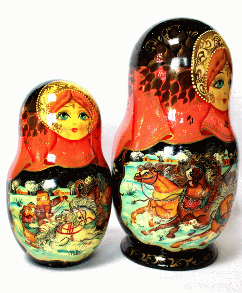 | Vintage Hand Painted Traditional Russia Nesting Doll Winter Troika 10 Dolls #251 $349.95 This is a very traditional nesting doll 10-pieces set made in Russia in 1990s. The doll is intricately hand painted all around in Sergiev Posad, Russia and signed by Russian artist Pantyukhova. The subject of paintings is famous Russian Troika in the winter scenes. Size 9.5'', set of 10 dolls. Russian Island is selling ONLY Russian made dolls!!! No cheap copies, all the dolls are authentic!!! In Russia making wooden objects which fit each inside other has many Centuries tradition. Gradually these figurines became to be carved in the shape of dolls. These dolls were made and painted by Russian craftsmen. This fabulous Russian doll was given the name MATRIOSHKA [matryoshka, matreshka] which originated from root of the word maternity. It became a symbol of FERTILITY and PERPETUATION. It is a good luck present for a very long time. Excellent vintage condition but it might have very small imperfections (see picture). Please look carefully at the pictures, as they are parts of the description. You will get the nesting doll you see on the pictures. Ship from Texas in 2 business days.