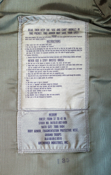 Body Armor Fragmentation Protective Vest Medium size Excellent Vintage Condition $149.95 This is great original vintage Greenbrier Industries body armor fragmentation protective vest in size Medium (37-41” chest). The vest is an original item, not a modified one, and was made in the United States. It is perfect for collectors of militaria. Greenbrier Industries are famous for its high-quality products which are built to last. The vest is in excellent vintage preowned condition. The vest is heavy 9LB and great for protection from fragmentation. It is a personal protection for the safety. Pictures are part of description. You buy what you see on the pictures