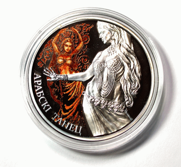 | Belarus Silver Proof 20 Ruble Coin 2012 Magic of Dance Series- Arabic Dance #194 $139.95 This is a Belarusian 2011 Silver 20 Rubles PROOF coin from the Magic of Dance series. The coin has a diameter of 38.61mm and weighs 28.28 grams of .925 silver. Used technique: Colored embossing. With a limited low mintage of 6,000 pieces, the coin has a rarity index of 86, making it a valuable collector's item. Obverse: At the top is a relief image of the State Emblem of the Republic of Belarus and an inscription around the circumference: РЭСПУБЛIКА БЕЛАРУСЬ (REPUBLIC OF BELARUS); in the center is a sign in the form of a spiral with rhythmically repeating, as if "dancing", elements of the composition consisting of fractals; at the bottom is the denomination: 20 РУБЛЁЎ (20 RUBLES) with the year of issue indicated on the left and the alloy standard on the right. Inscriptions: Cyrillic, Latin; Inscription: REPUBLIC OF BELARUS, 20 RUBLES, 2012, Ag 925. The reverse: Colored. In the center are two dancing women against a background of Arabic ornamentation; to the left is an inscription around the circumference: "Arabic ornamentation." To the left is an inscription around the circumference: ARABIC DANCE (ARABIC DANCE). Inscription: Cyrillic Caption: ARABIC DANCE; Designer: Svetlana Nekrasova. Minted at BH Mayer Kunstprageanstalt, Karlsfeld, Germany. Release date: December 28, 2011. The coin is in uncirculated, proof mint condition and comes in its original airtight capsule and Belarusian Bank certificate of authenticity. You buy what you see on the pictures. Pictures are part of description. Ship from Texas within 2 business days. NOTE: The capsule was not opened; the pictures were made through the capsule plastic; the coin is in superb MINT condition; any imperfections you see are on the plastic.