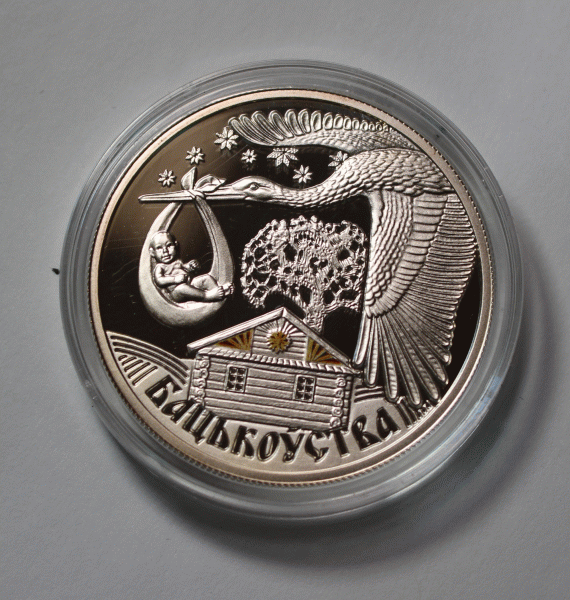 | Belarus Silver 20 Ruble Coin 2012 Slavs Family Traditions Series-Fatherhood #191 $144.95 This is a Belarusian 2012 Silver 20 Rubles BU coin from the Slavs' Family Traditions Series – Fatherhood. The coin has a diameter of 38.61mm and weighs 33.63 grams of 0.925 silver. Used technique: Pad–printed elements. With a limited low mintage of 10,000 pieces, the coin has a rarity index of 89, making it a valuable collector's item. Obverse: Emblem of the Republic. Decorative composition of straw craft representing DNA. The reverse: Stork bringing a baby. Designer: Svetlana Nekrasova. Minted at Polish Mint (Mennica Polska), Warsaw, Poland. Release date: October 23, 2012. The coin is in uncirculated, BU mint condition and comes in its original airtight capsule and Belarusian Bank certificate of authenticity and Fatherhood brochure. You buy what you see on the pictures. Pictures are part of description. Ship from Texas within 2 business days. NOTE: The capsule was not opened; the pictures were made through the capsule plastic; the coin is in superb MINT condition; any imperfections you see are on the plastic.