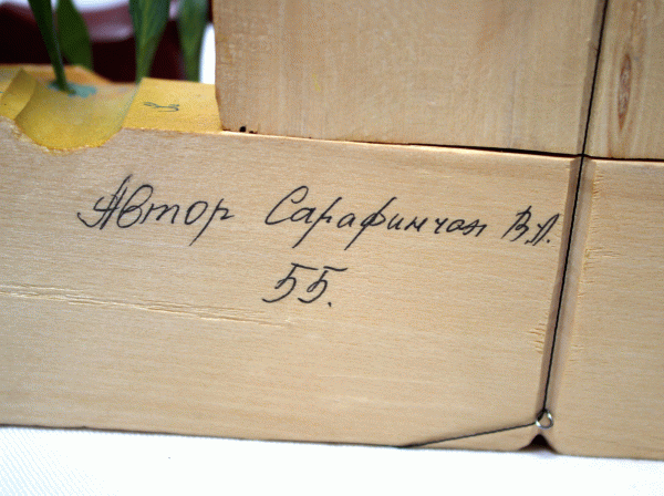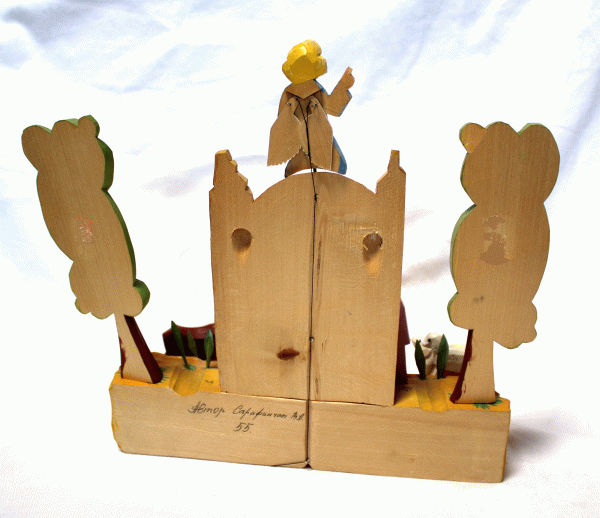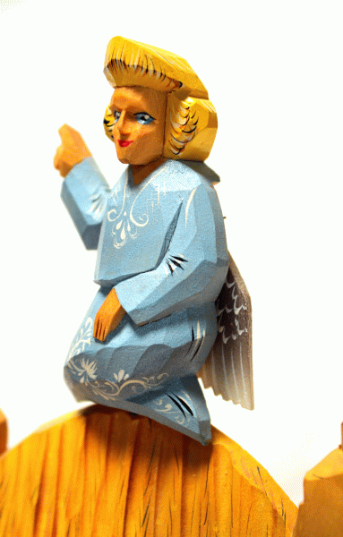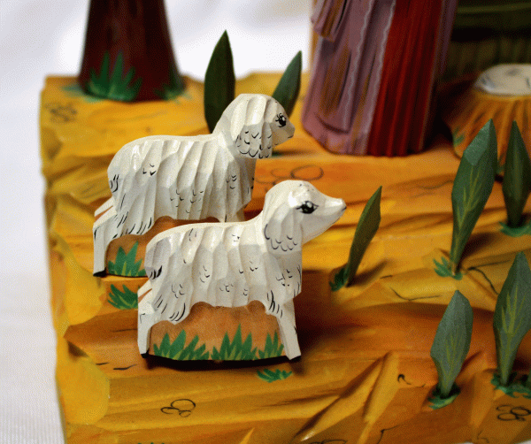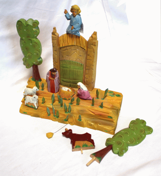 | Christmas Hand Carved and Painted Wooden Nativity Set Removable Figurines #72 $299.95 This exquisite, one-of-a-kind Nativity set has been beautifully hand-carved and hand-painted by the Russian artist Sarafinchan. Crafted entirely from wood, the scene is remarkably detailed. Most figurines, including the trees, animals, and grass, are removable, allowing for versatile display options. A unique kinetic feature allows the angel's wings to move when an attached string is pulled. In excellent vintage condition, this set measures 11'' W x 9.5'' H x 3.25'' T. We guarantee you will receive the exact item pictured, as the images are an integral part of the description. Shipping from Texas within 2 business days, this unique nativity scene makes a wonderful holiday present or a standout addition to any collection.
