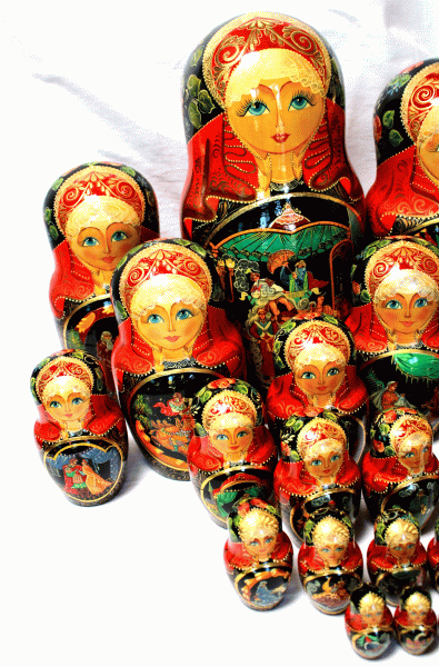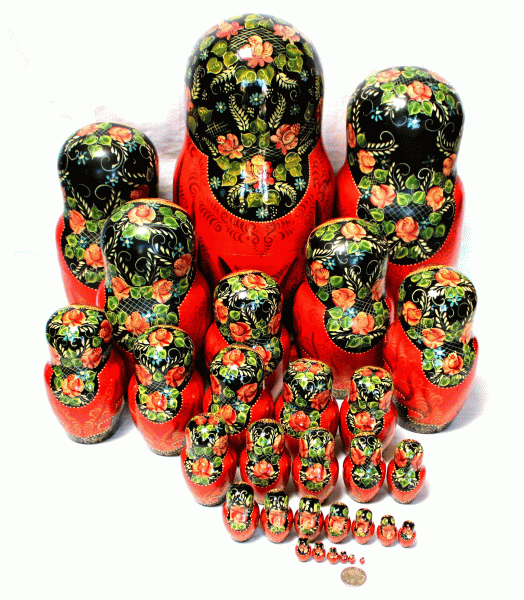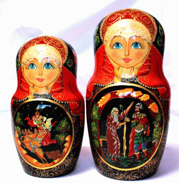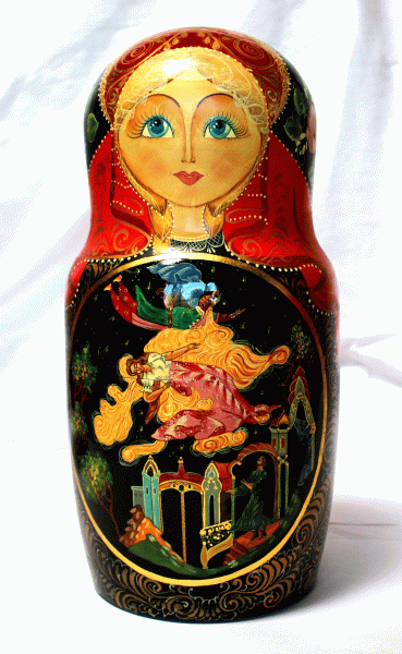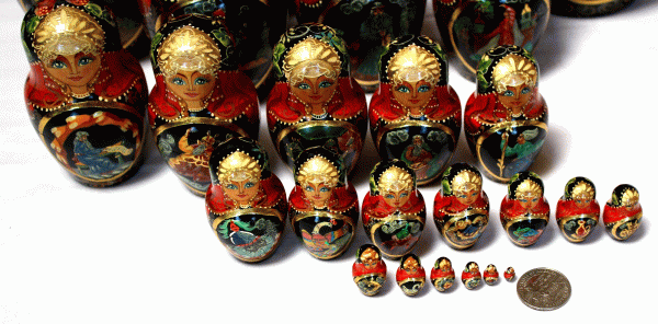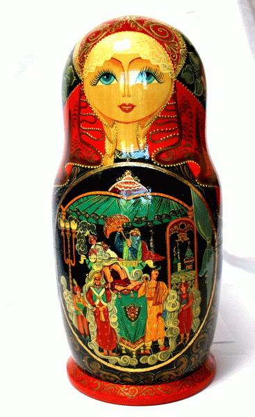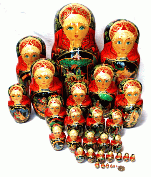 | Vintage 30-Pieces Russian Wooden Nesting Doll (matrioshka) Hand Painted Artist Signed Fairy Tales #164 $4,850.95 This unique, magnificent 30-piece matryoshka nesting doll set, standing 16 inches tall, is a true one-of-a-kind collector's item in excellent vintage condition. Hand-painted and signed by the Russian artist Vasilieva in 2000, each piece showcases beautifully detailed scenes from the classic Russian fairy tale Ruslan and Lyudmila by the famous poet Alexander Pushkin. You will receive the exact doll pictured, along with a black and white English copy of the fairy tale. The item will ship from Texas within two business days. The tradition of crafting wooden objects that fit inside one another has centuries-old roots in Russia. Over time, these figurines evolved into the nested dolls known as Matryoshka (also spelled matrioshka or matreshka). The name derives from the root word for maternity, and the doll has become a powerful symbol of fertility, perpetuation, and a traditional token of good luck.