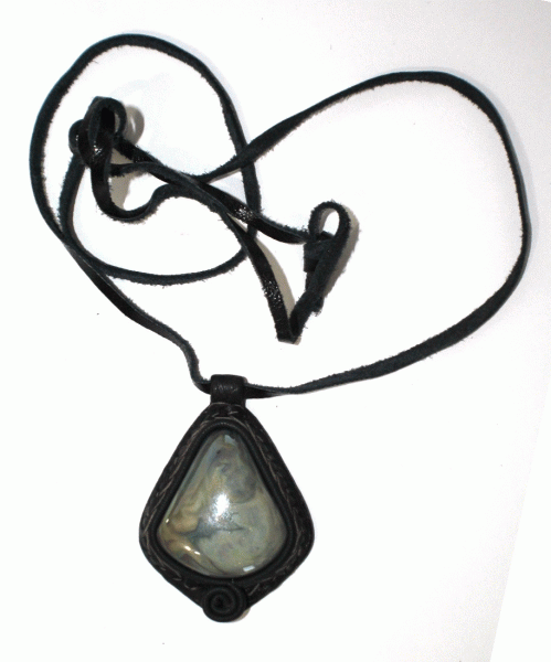 | RUSSIAN HAND MADE AGATE JEWELRY MOUNTED IN LEATHER-PENDANT -05 $41.00 This piece of beautiful jewelry is a unique pendant made by Russian artist. It is made in Russia out of ''landscape'' agate hand mounted in leather. The leather design is all hand made. Because the pendants are one-of-a-kind they may be slightly different from the picture but they are very similar. Each pendant has leather string, which can be adjusted for the different length. It is a unique piece of jewelry, which is very stylish for this year. Size without hanging decoration is 2''