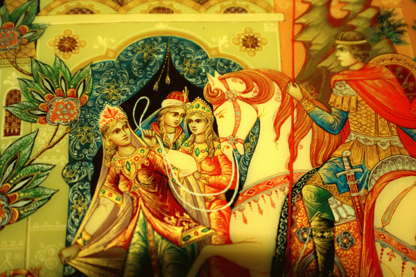 | Russian Lacquer Box 412 - 'Ratmir at the Gates of the Magic Castle'' $596.00 A great example of traditional combination of elements of architecture and landscape in Palekh School of Art. Skillfully painted faces, bright colors and gold filigree give this box a well-dressed and elegant look. A great addition to your collection ! School - Palekh, Artist - Serov Size - 7.75x6.75x2h