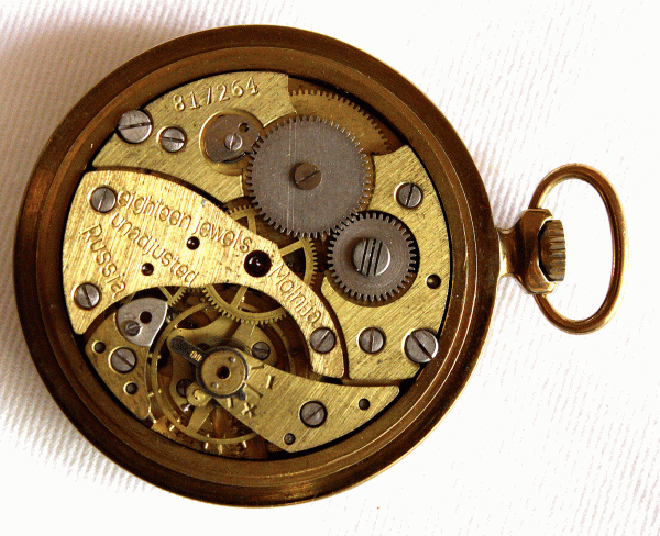 | Russian Pocket Wind-Up Watch - Soccer Players-04 $139.00 This Russian Pocket Watch has 18 jewels movement. Because the watch has balance, lever escapement through the pallet, you can wind the watch in both directions once a day. Single winding run down time not less then 35 hours. Case is made out of heavy stainless steel, diameter 1.75 inches; I believe that the case is gold plated. The watch is coming with original 12 inches chain. It is very nice for use or collection. This Russian Pocket Watch was made at MOLNIYA plant in Chelyabinsk near Ural Mountains in Siberia, Russia in 1995. The Molnija Factory began its production on November 17, 1947 by the order of the Council of Ministers of the USSR. The first order for the watches was the USSR Ministry of Defense. In October 2007 the Molniya plant ceased production of consumer products. Therefore, these watches are already in history and are collectibles.