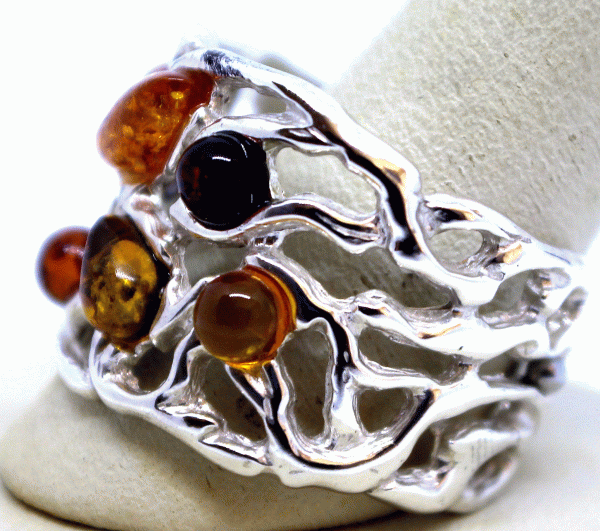 | Baltic Amber Ring - Autumn Beauty $73.95 This is beautiful Baltic Amber ring hand set in sterling silver. Size of the ring is 9.5 (adjustable); Width of the band is 0.7''. This beautiful Baltic Amber has been popular throughout the World for Centuries and is reflected in many of the regions folk tales. Amber Jewels are actually pieces of petrified tree sap and found in only three areas throughout the World. Occasionally, you may find pieces of insects or plants trapped inside these jewels but they are quite rare. Amber has a unique quality of being light enough to float on water and was originally explained through folk tales as being gifts from the young maiden Ambrella to her parents after she was kidnapped by the Prince of the seas. All our amber is from the Baltic Sea and it is set in sterling silver.