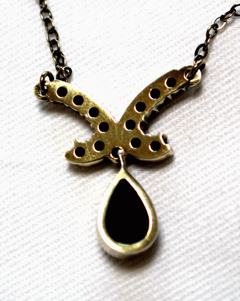 | Genuine Garnet Necklace Batterfly Drop - 26 $189.95 Bohemian garnet (Czech Republic) is considered to be the most famous garnet in the world. It is well known for its deep burgundy color and special cut of the stone. Czech Republic and especially its Bohemian Region have a very long history of making garnet jewelry. In old times Czech Kings and Queens had the most beautiful garnet jewelry and garnet was called Bohemian Rubies. We offer you genuine garnet jewelry from Bohemian Region in Czech Republic. All stones are hand cut and hand set in sterling silver with gold filling. Sterling silver mark 925 is stamped on each item (see picture). This garnet jewelry will be great addition to any jewelry collection. Straight from the factory. This item is very professionally done with very steady and safe setting (see picture of the back). Size of Pendant is 1.5 inches long; length of chain is adjustable; it can be 17 or 15.75 inches.